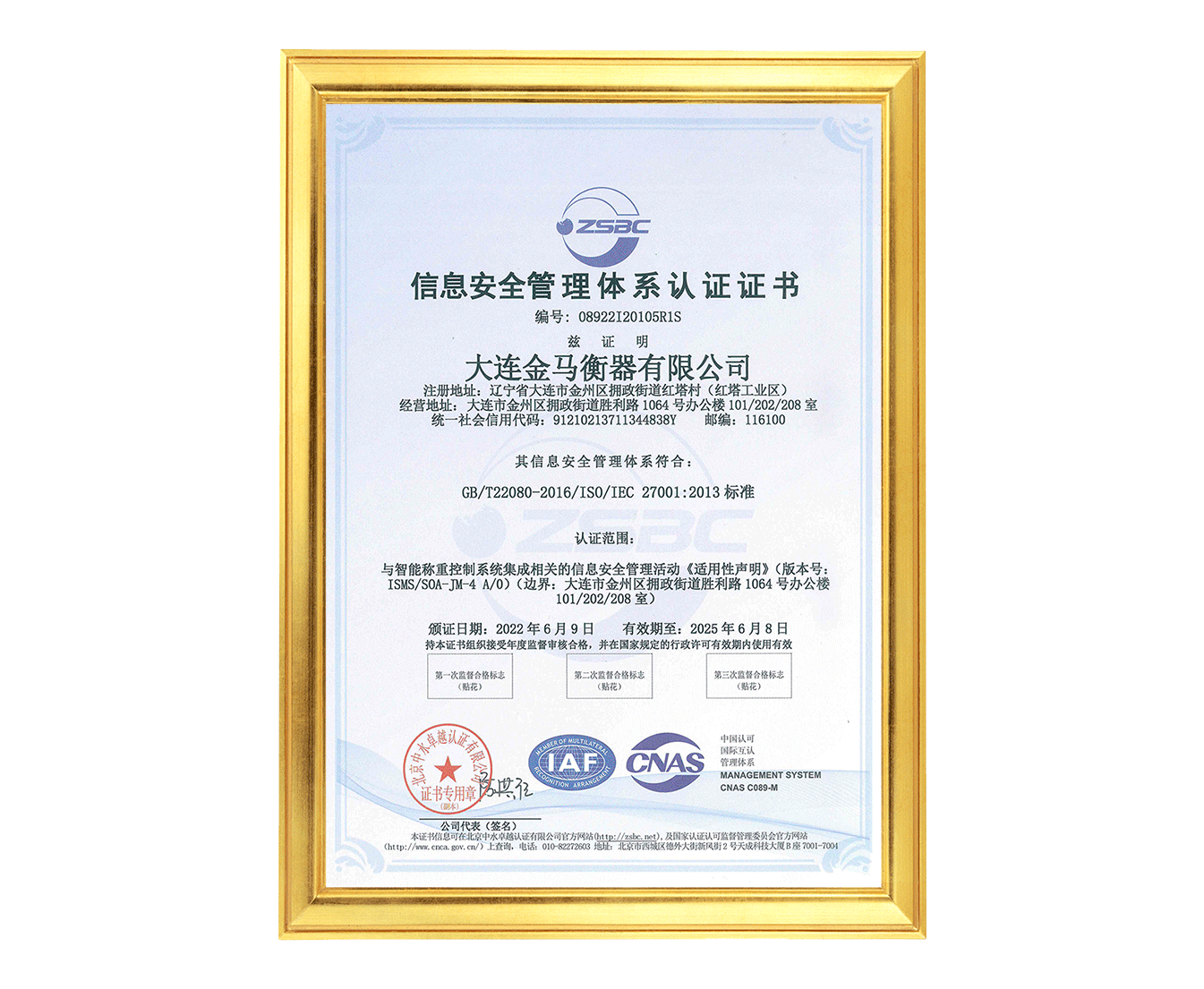 信息安全管理體系認證證書
